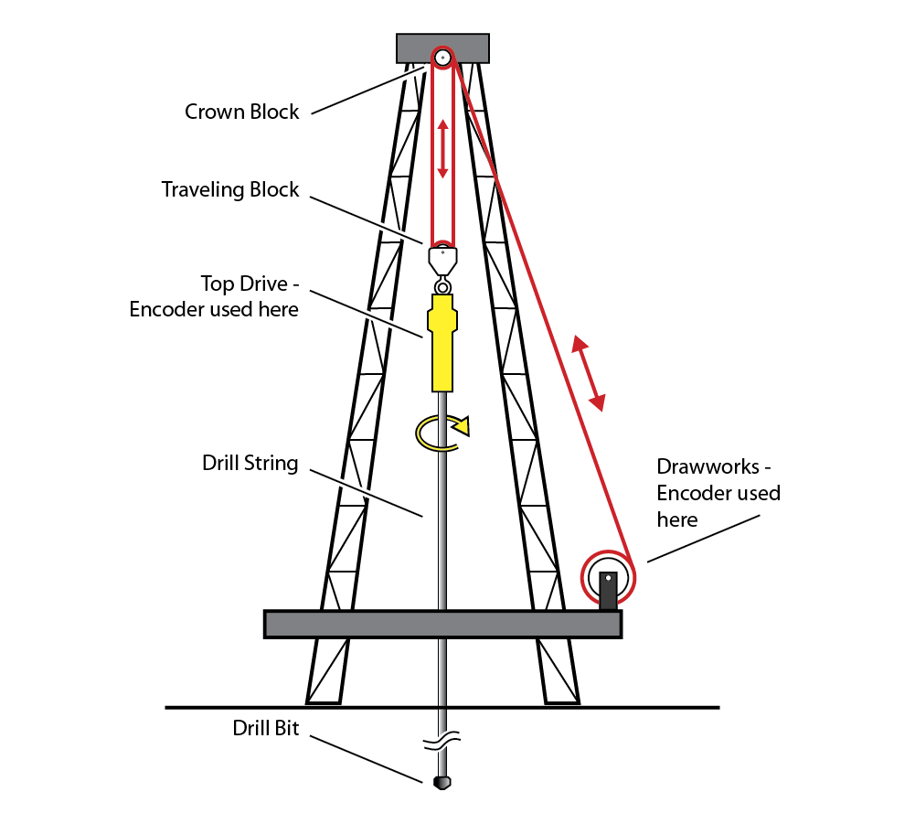 Position control is crucial. How much pipe has gone down the hole? How deep is the well? Encoders can be used on the drawworks to monitor motor or gear rotation. This helps keep track of the traveling block’s position, and thus the depth of the drilling equipment. Knowing the precise position helps rig operators track whether or not they are on schedule, know what type of rock they’re drilling through, and identify when to change drill bits, for example.