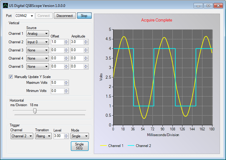 The QSB Scope is capable of displaying 1 channel of analog and 4 channels of digital input. Any single channel can be configured to trigger a synchronized screen capture on a rising or falling edge. Basic trigger modes supported include auto, normal, and single sequence.